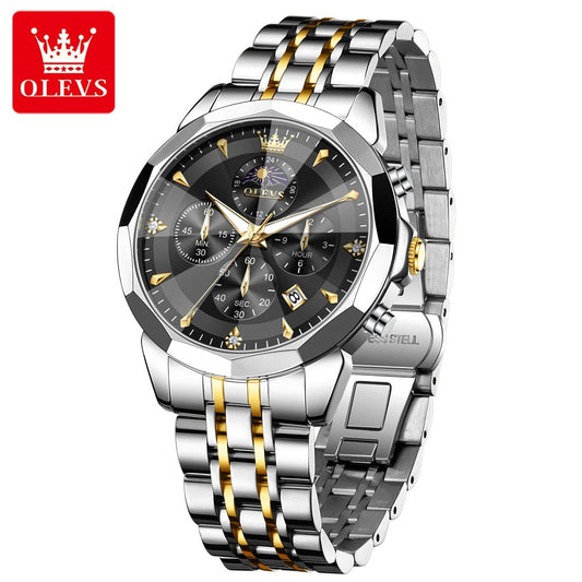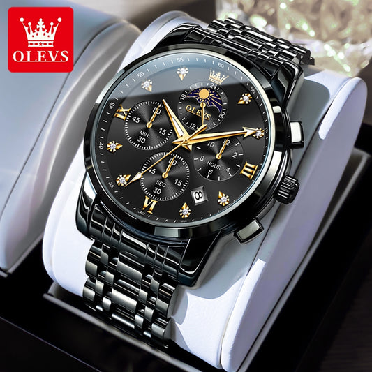 OLEVS 3678 Moon Phase Watches Waterproof Man Fashion Chronograph Quartz Big Dial Original Calendar Hand Stainless Watch for Men