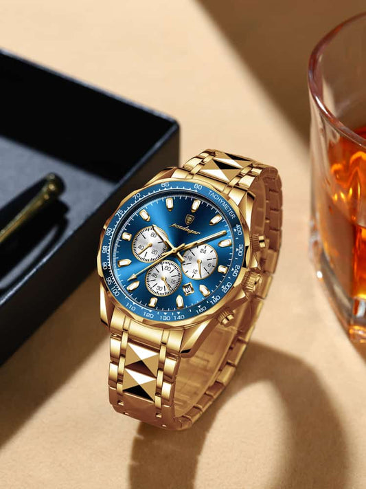 POEDAGAR-965 Men's Multifunctional Quartz Watch Fashionable Night Light Waterproof Stainless Steel Band Buckle Clasp Glass Dial