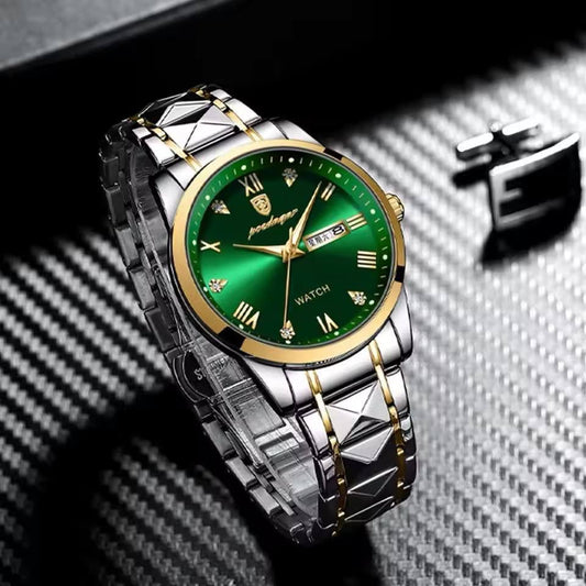 Poedagar 985 Luxury Fashion Stainless Steel Green Dial Watch Men Waterproof Luminous Week Date Sport Men Quartz Wristwatch