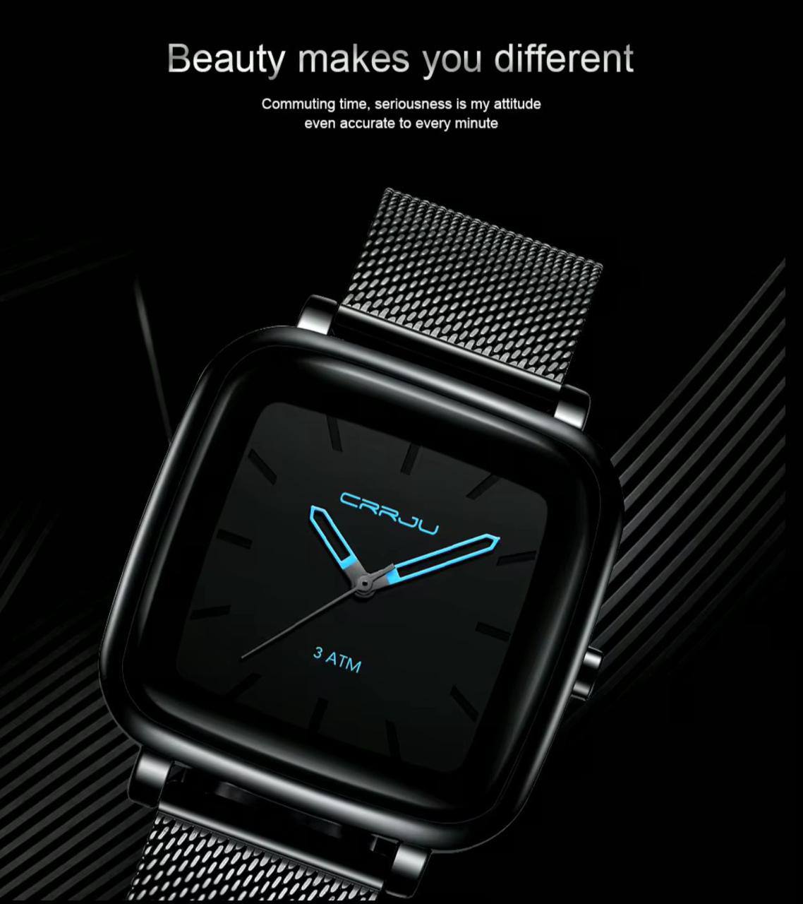 3ATM Waterproof CRRJU 2199 Fashion New Design Quartz Watch Men Square Dial Mesh Strap Wristwatch Men's Watches