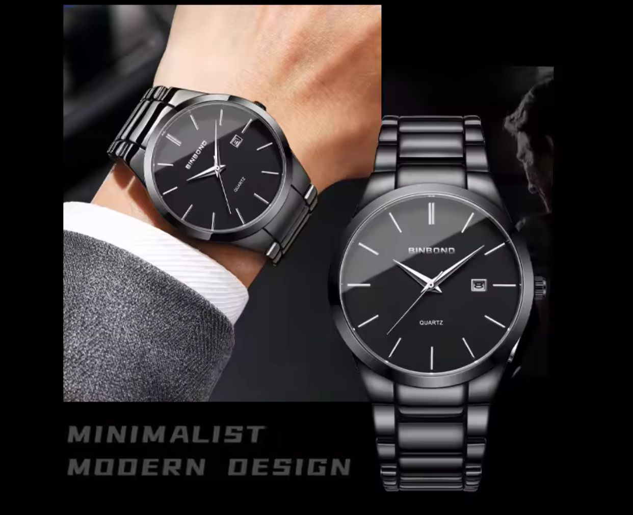 BINBOND-077 Men's Fashion Steel Belt Watch New Multi-Functional Calendar Waterproof Quartz Movement Dial Window Glass 20mm Alloy