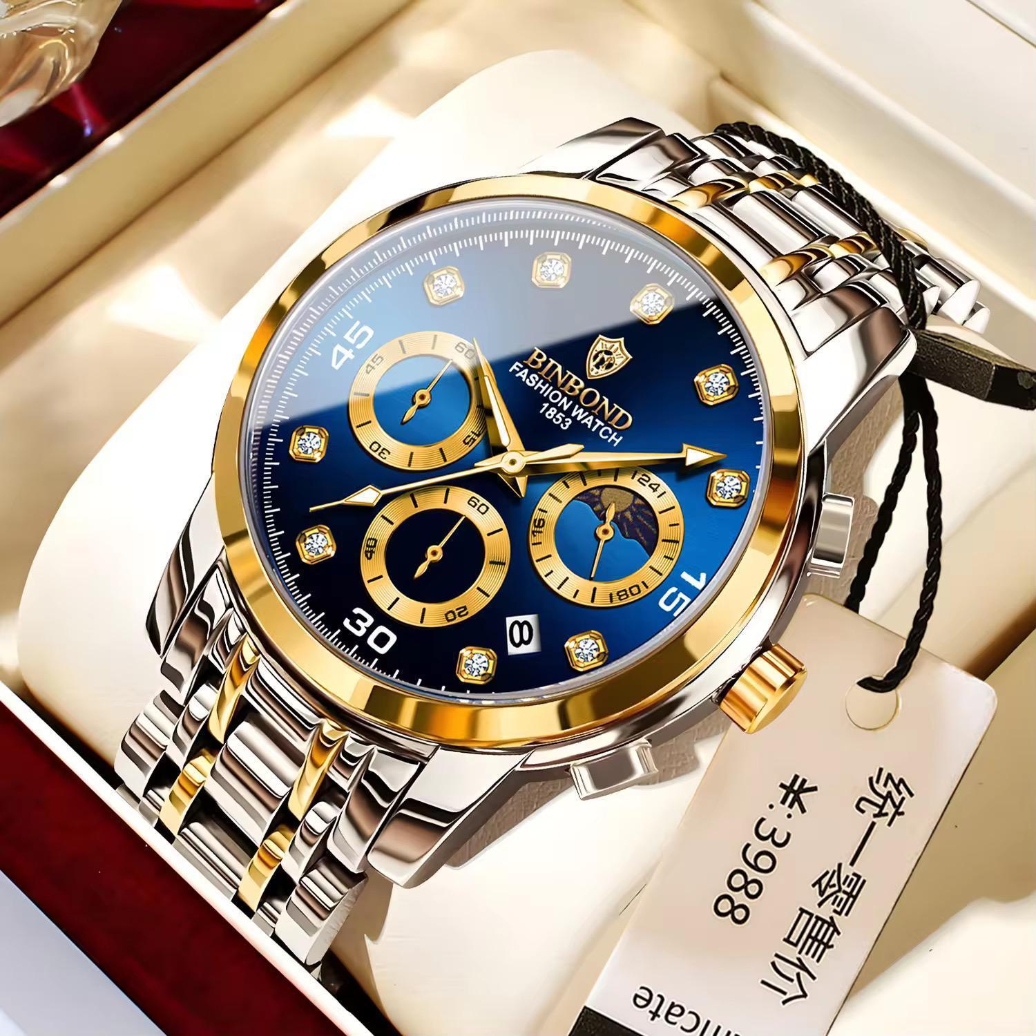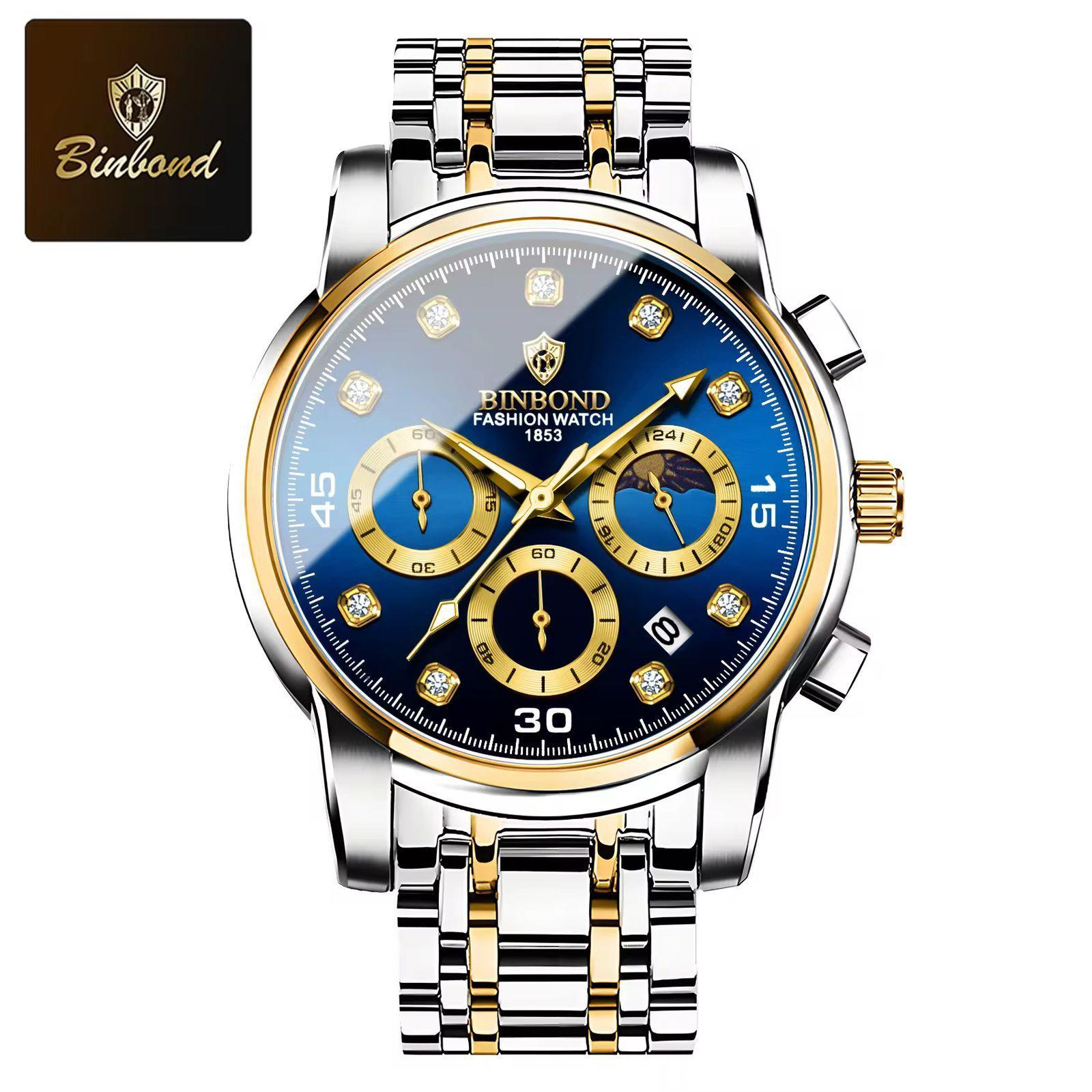 Binbond B707 Watch Casual Chronograph Men's Watches Stainless Steel Business Wristwatch Quartz Clock with Luminous Pointers for Men