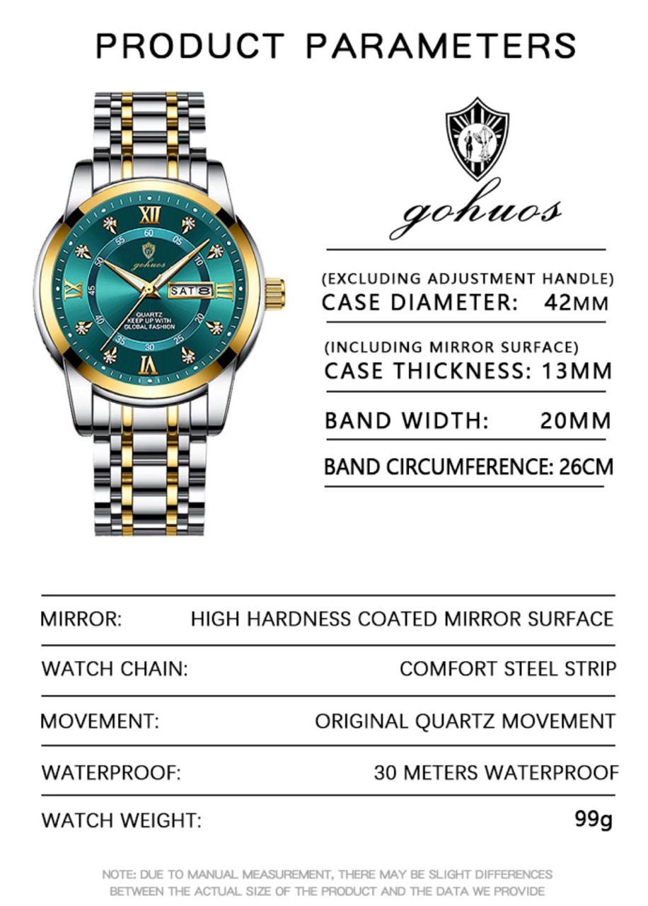 Business Casual Watch for Men GOHUOS 808 Stainless Steel Top Quality Luxury Luminous Date Week Sport Wrist Watches