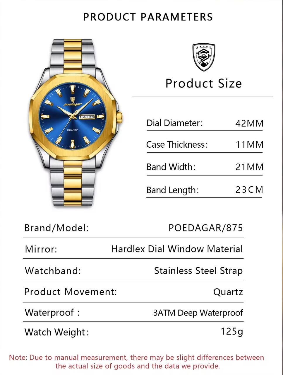 High quality POEDAGAR 875 Men Wristwatch Waterproof Luminous Original Man Watch Stainless Steel Sport Quartz Men's Watches