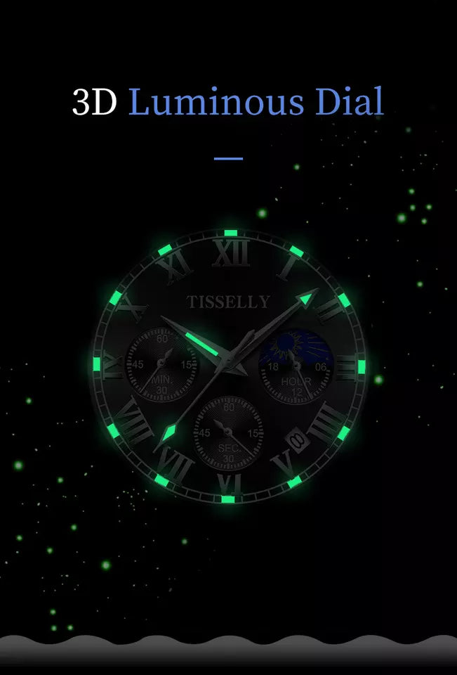 New TISSELLY 6601 Gold Watch Diamond Steel Moon multi-function Quartz Mens Watches Top Brand Luxury