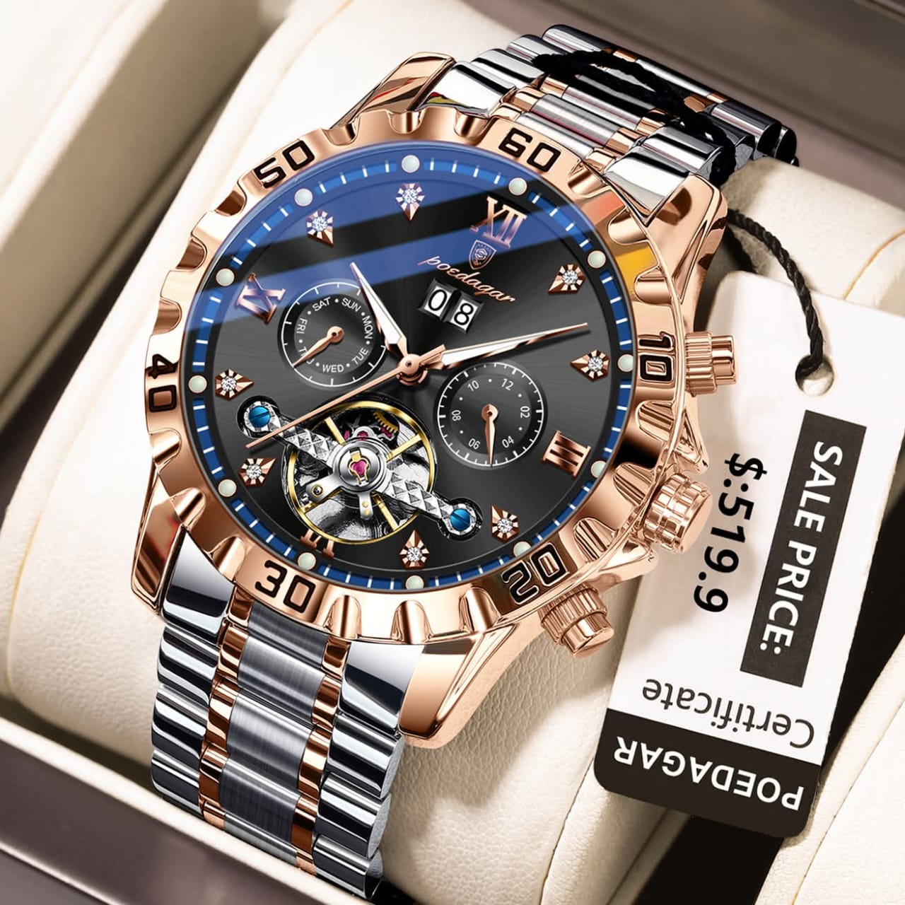 Engineered with precision, the Poedagar 1412 automatic mechanical watch combines sophisticated functionality with luxury design. This chronograph timepiece features a robust stainless steel construction, comprehensive calendar display including day, date, and month, and reliable water resistance. The strong luminous markers ensure visibility in all conditions, while two distinct color options allow for personalized style. A masterful blend of technical excellence and refined aesthetics for the discerning gentleman.