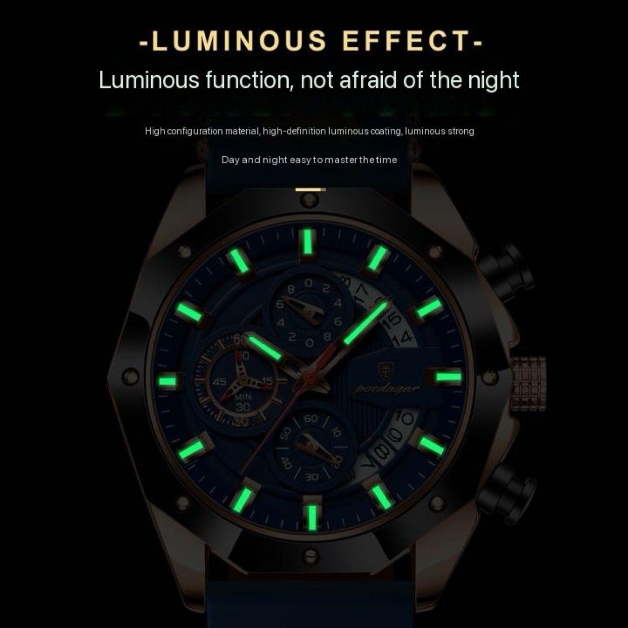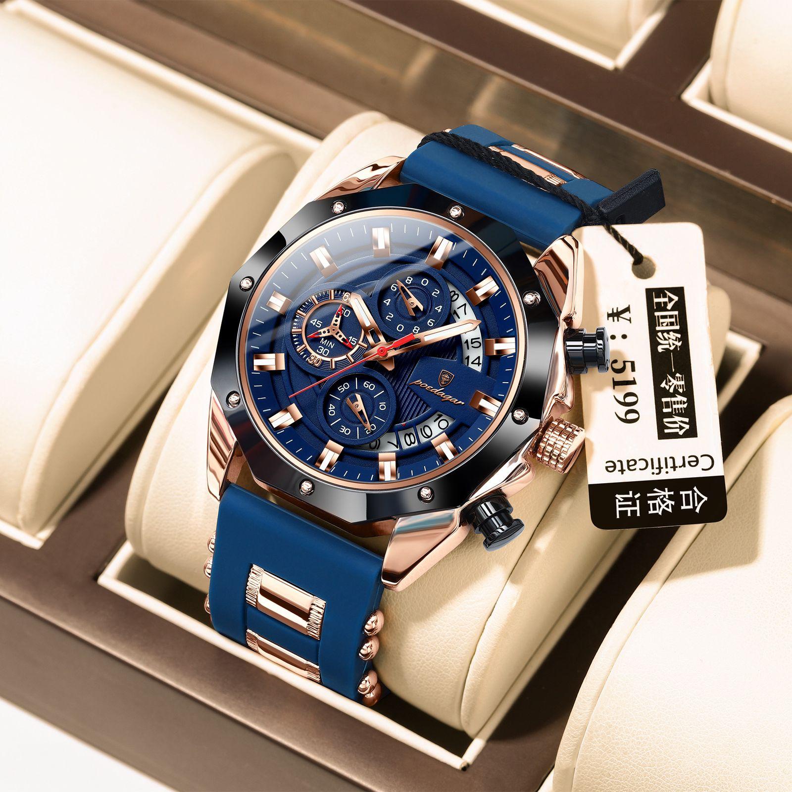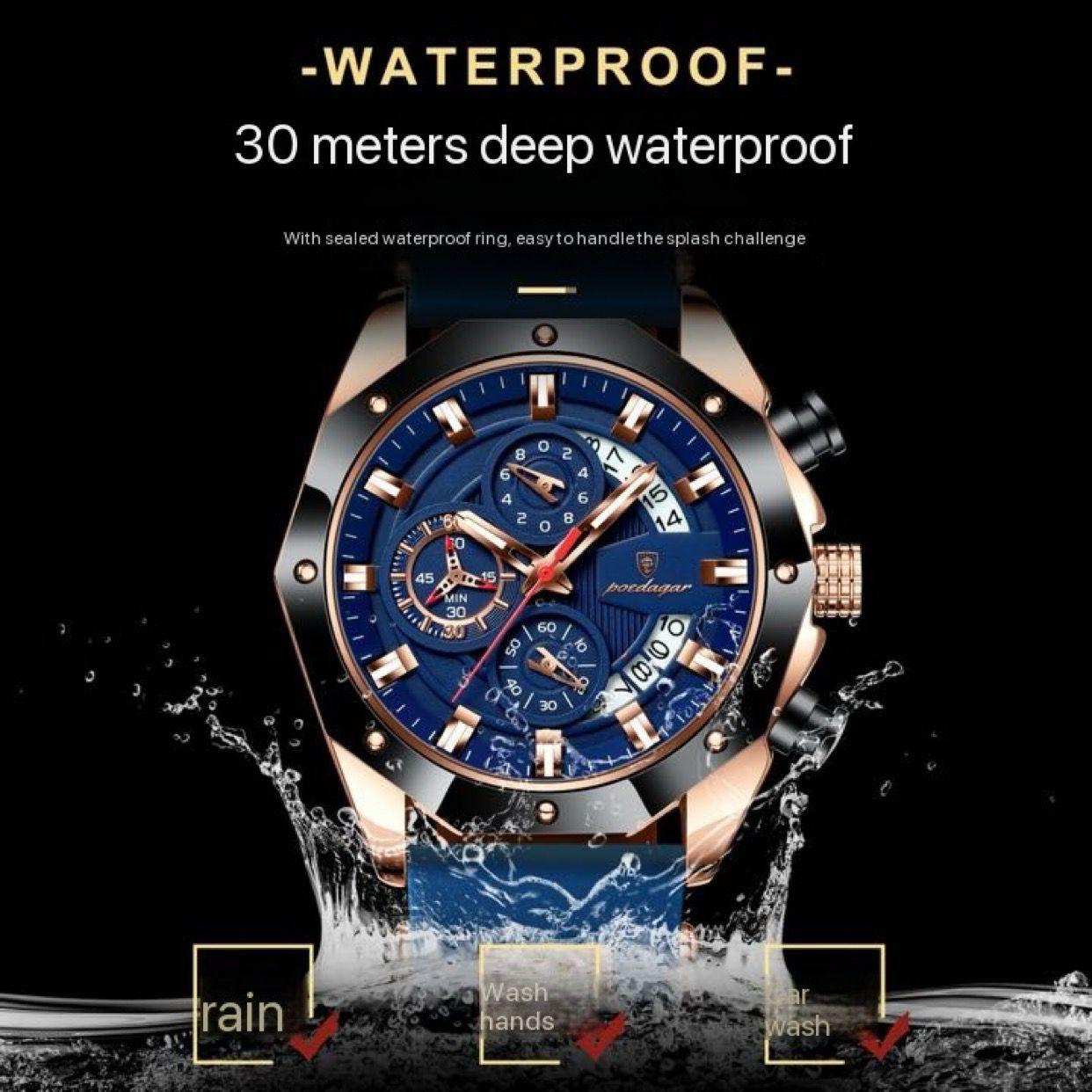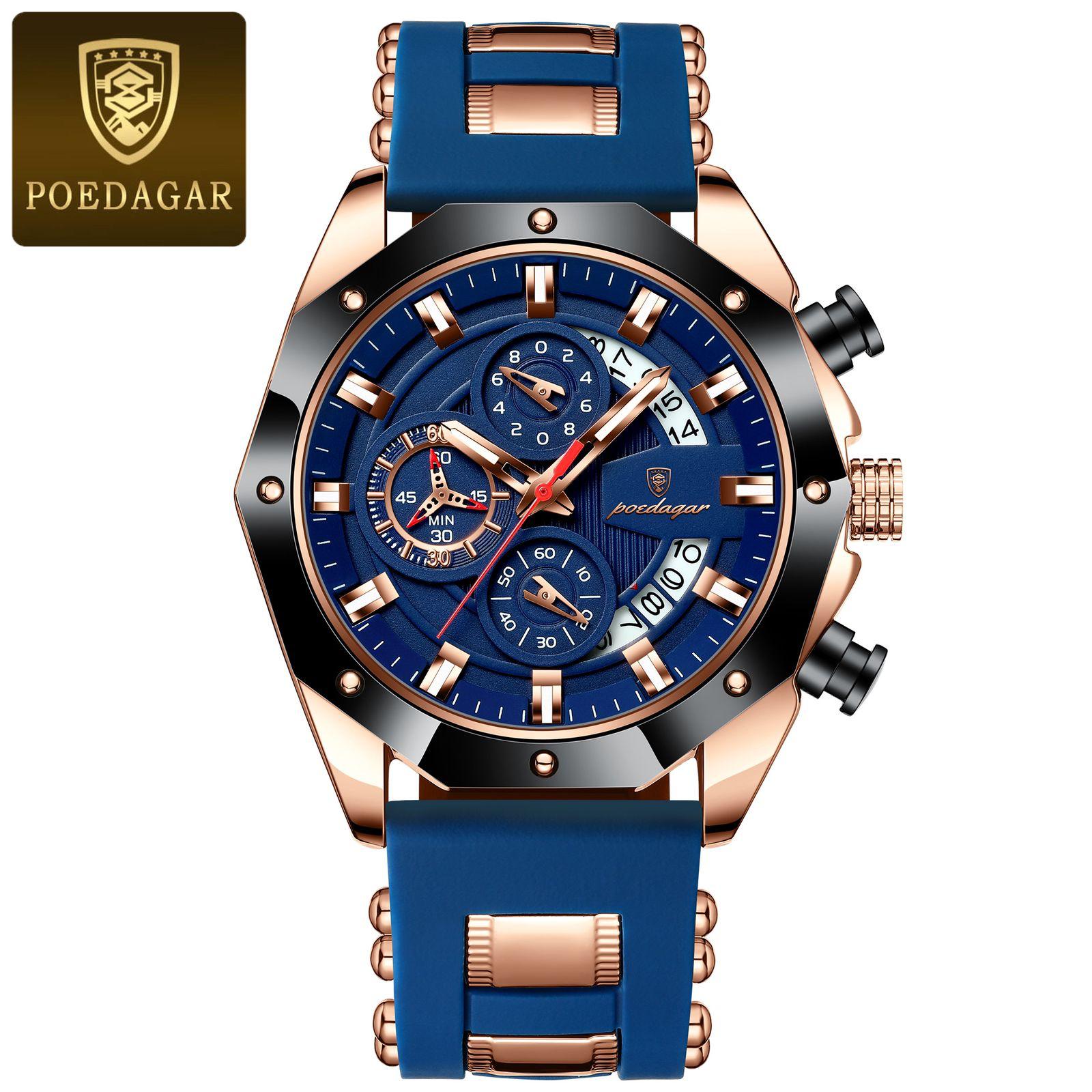 POEDAGAR 913 Waterproof Luminous Sport Business Chronograph Men Night Light Watch Blue Silicone Strap Japan Quartz Men's Watches