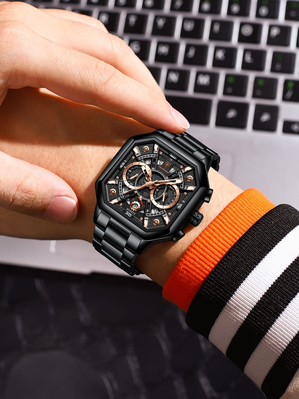 Poedagar 983 Luxury Square Stainless Steel Quartz Men's Watches Waterproof Luminous Chronograph Watch for Men