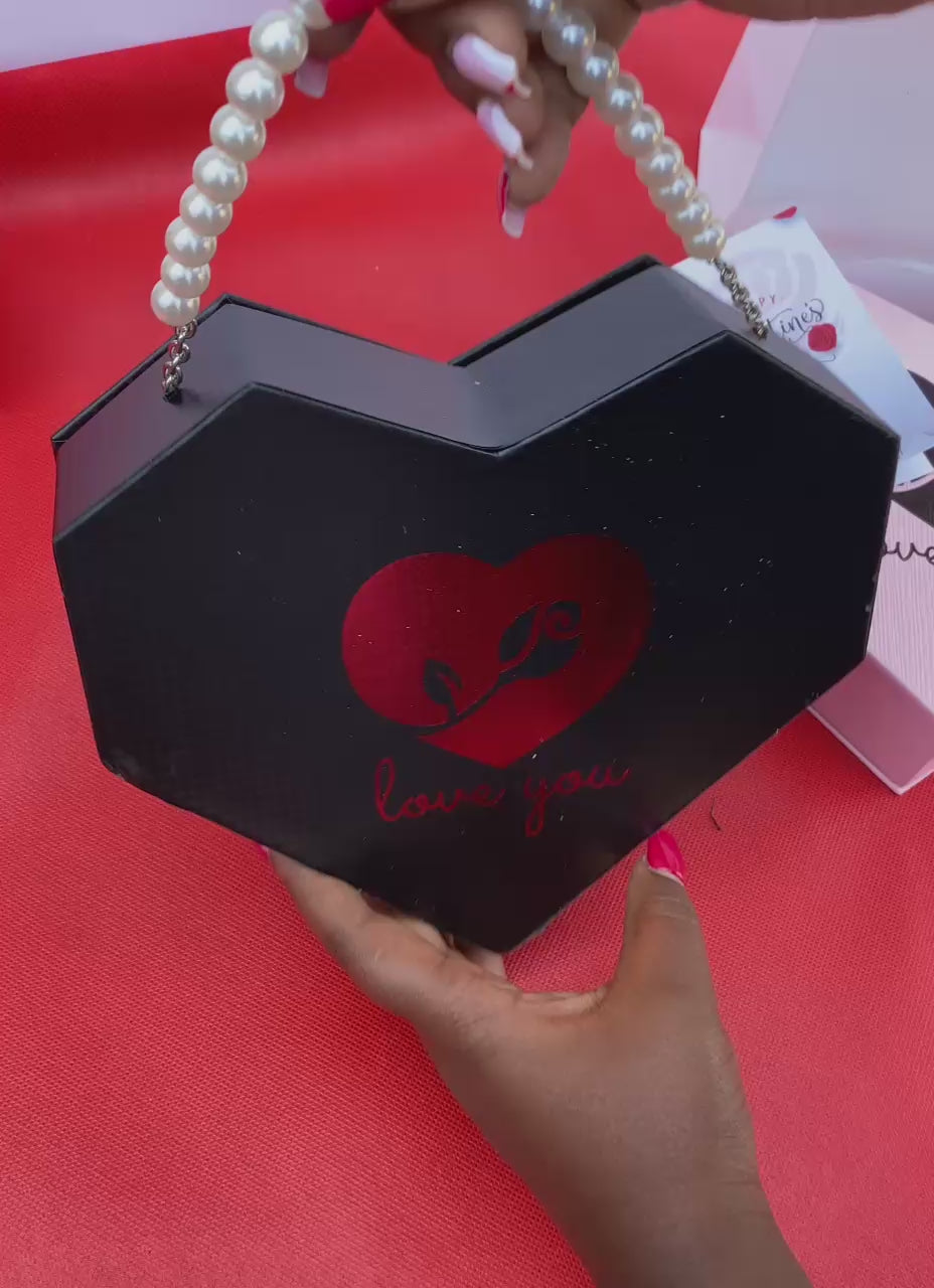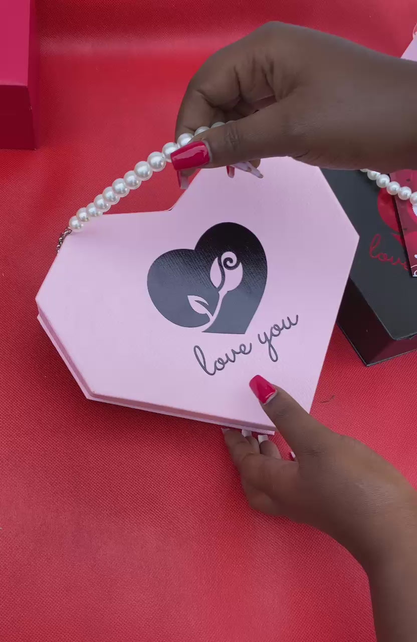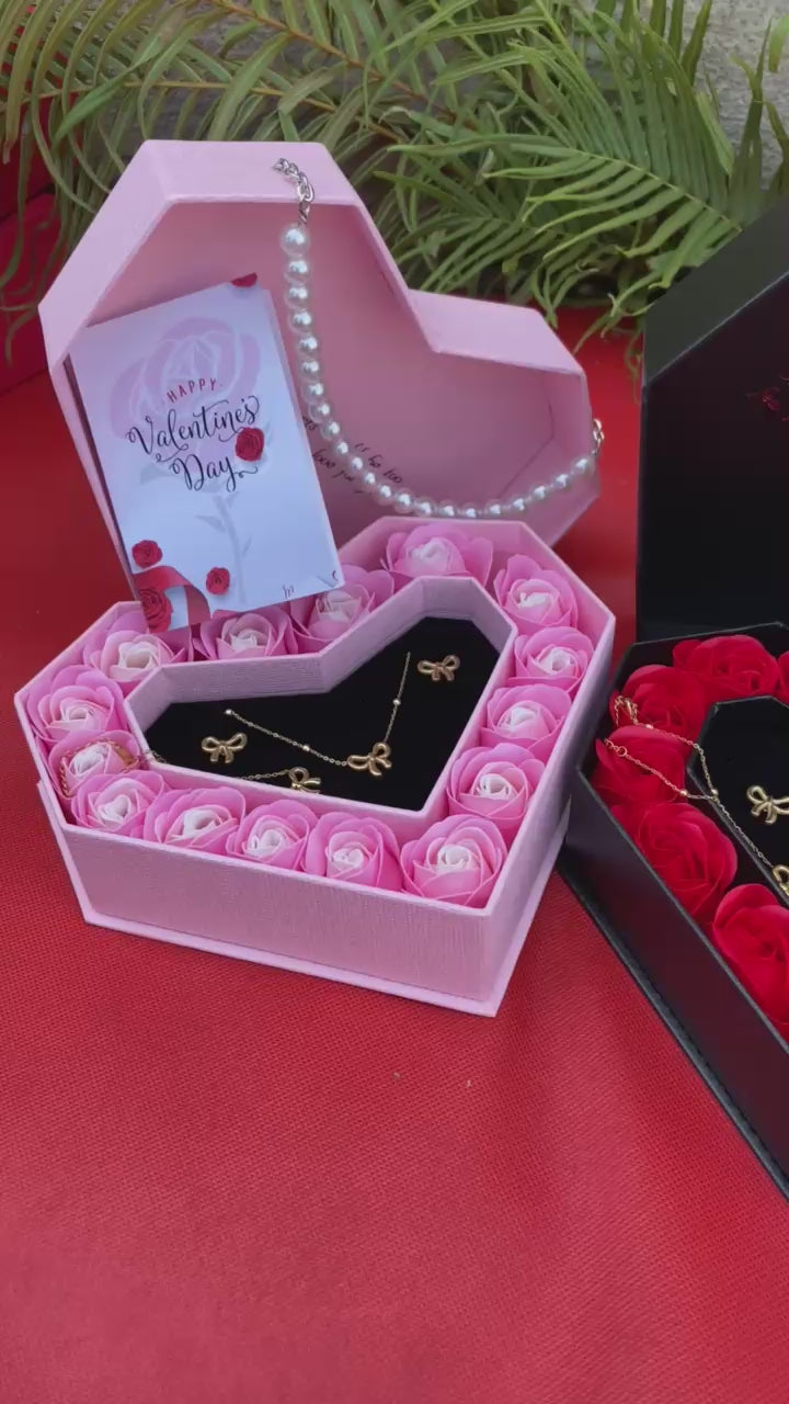 Surprise her this Valentine’s Day with the perfect gift set featuring preserved roses, a bracelet, necklace, earrings, and a card with a stylish gift bag. Available in elegant pink and black